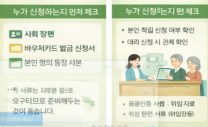 대리 신청은 가능하지만, 담당자 확인 과정이 더 꼼꼼하게 진행될 수 있어 장애인활동지원 신청 서류를 더 정확히 준비하는 것이 좋습니다. 대리 신청을 계획하고 있다면, 기본 서류에 더해 대리 관련 장애인활동지원 신청 서류까지 한 번에 준비하는 것이 접수 지연을 줄이는 방법입니다.